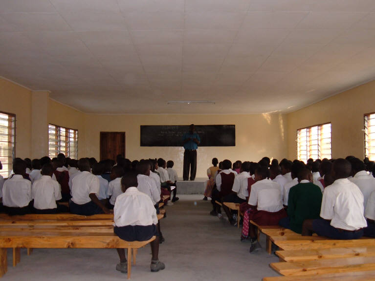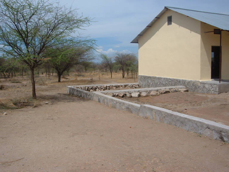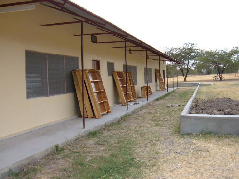 Although initial construction on building three was completed in late 2004, work has been ongoing. The first classroom was occupied by the sixth grade in January, 2005...the second classroom will be occupied by the seventh grade in January, 2006. The Chapel was opened in January, 2005, the Library was opened in August of the same year, and work has been continuing. Yet to be completed is the computer room and small kitchen. The building was dedicated by Mwanza Regional Commissioner, Daniel Noojay, in August, 2004. Click on photos to enlarge Western end of building New library shelves in front of building New Chapel Regional Commissioner dedicating building New Library New Library Completed building |